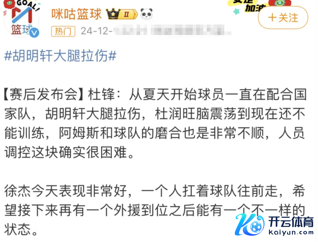 这场广东输球天然有缺席的原因,但是杜锋平直甩出了一句话,他说本年夏天咱们的球员一直在合营国度队,胡明轩大腿拉伤了,杜润旺脑颠簸,当今也参与不了测验,这是他们输球的原因,两个中枢球员打不了。