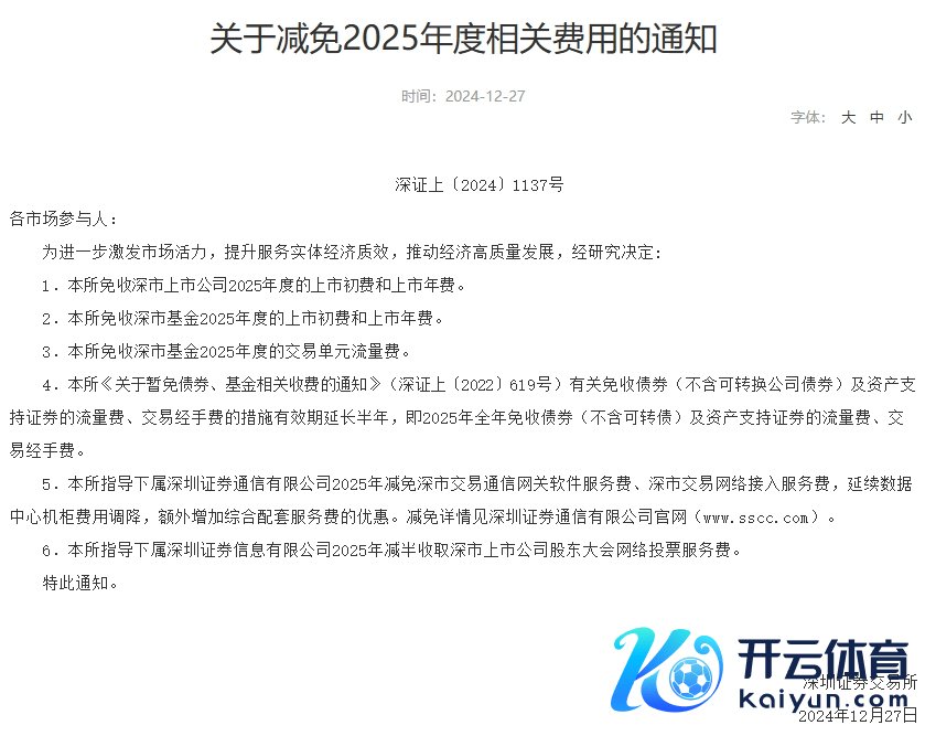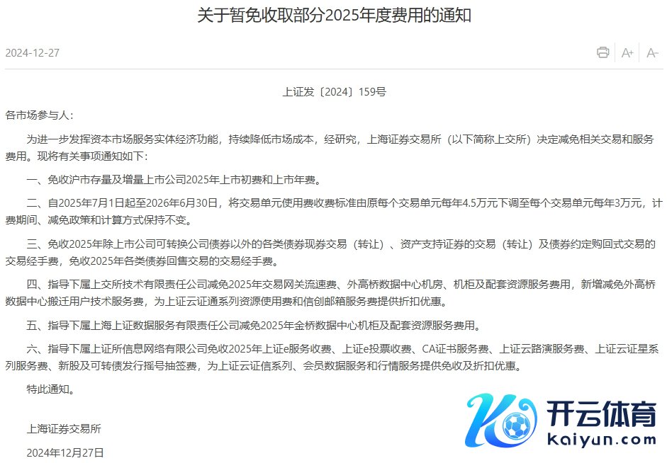 12月27日开云电子,上交所和深交所发告示知称,免收沪深两市上市公司2025年上市初费和上市年费等用度。
