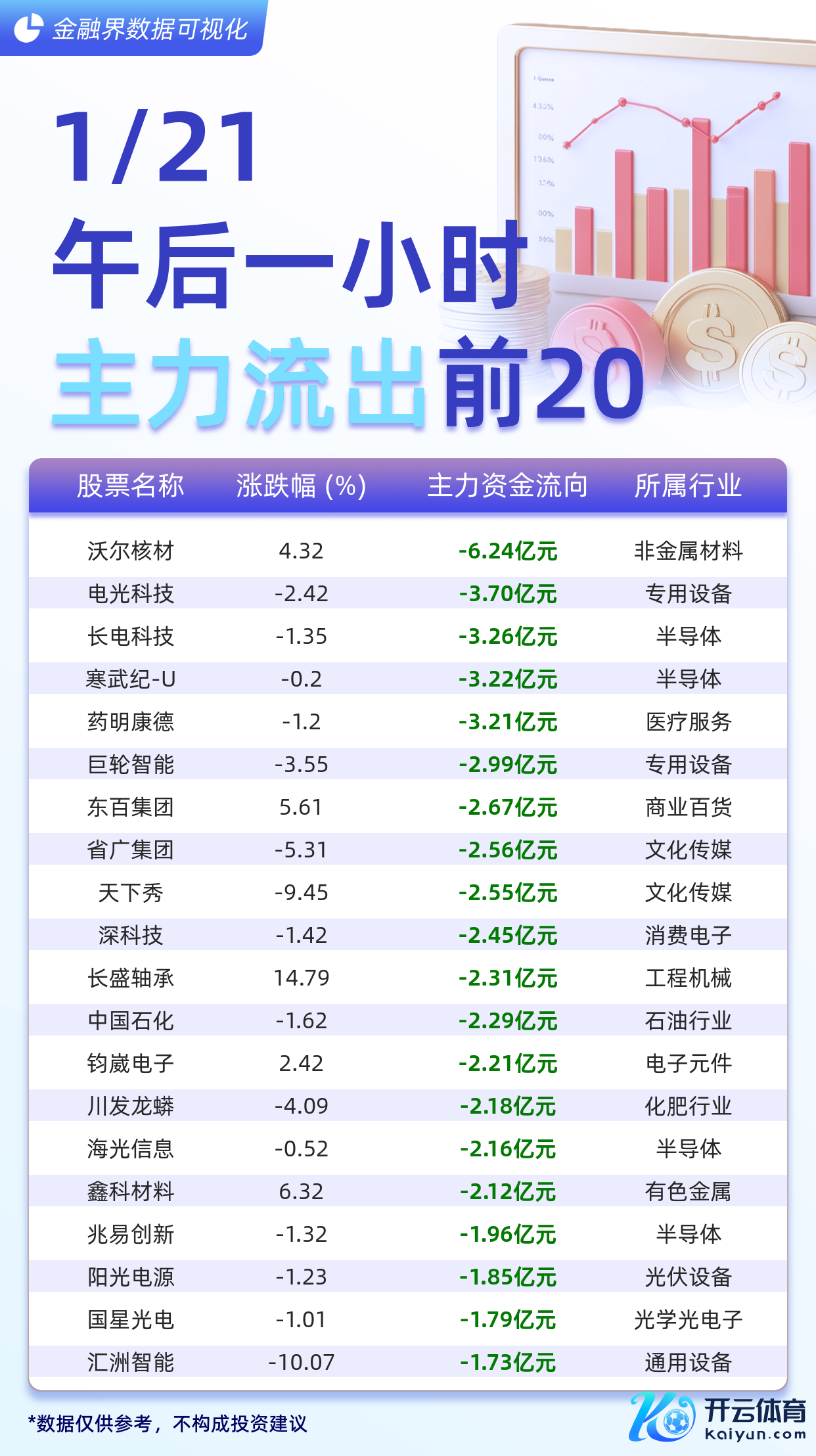 终局1月21日午后一小时,主力资金流出前20的股票别离为:沃尔核材(-6.24亿元)、电光科技(-3.70亿元)、长电科技(-3.26亿元)、寒武纪-U(-3.22亿元)、药明康德(-3.21亿元)、巨轮智能(-2.99亿元)、东百集团(-2.67亿元)、省广集团(-2.56亿元)、六合秀(-2.55亿元)、深科技(-2.45亿元)、长盛轴承(-2.31亿元)、中国石化(-2.29亿元)、钧崴电子(-2.21亿元)、川发龙蟒(-2.18亿元)、海光信息(-2.16亿元)、鑫科材料(-2.12亿元)、兆易翻新(-1.96亿元)、阳光电源(-1.85亿元)、国星光电(-1.79亿元)、汇洲智能(-1.73亿元)。
